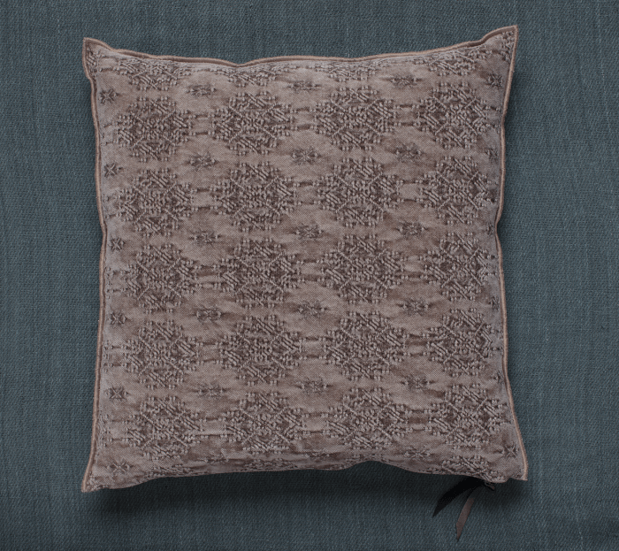 Diversas técnicas textiles se conjugan para darle forma a estos preciosos cojines en terciopelo tejido en Jacquard, stone wash.