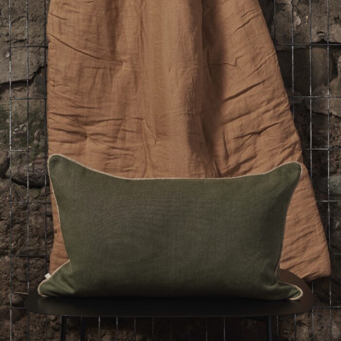 Cojín lino algodón con borde en yute natural, tamaño 40x65cm color kaki, con relleno de pluma