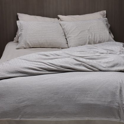 Una cómoda e innovadora forma de armar tu cama. Set de funda de plumón cuadrillé + sábana bajera + funda de almohada a rayas.