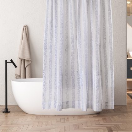 Cortina de baño 100% lino, estampada a mano en tonos azul-celestes. Tamaño 180x190cm.$74.900ver producto